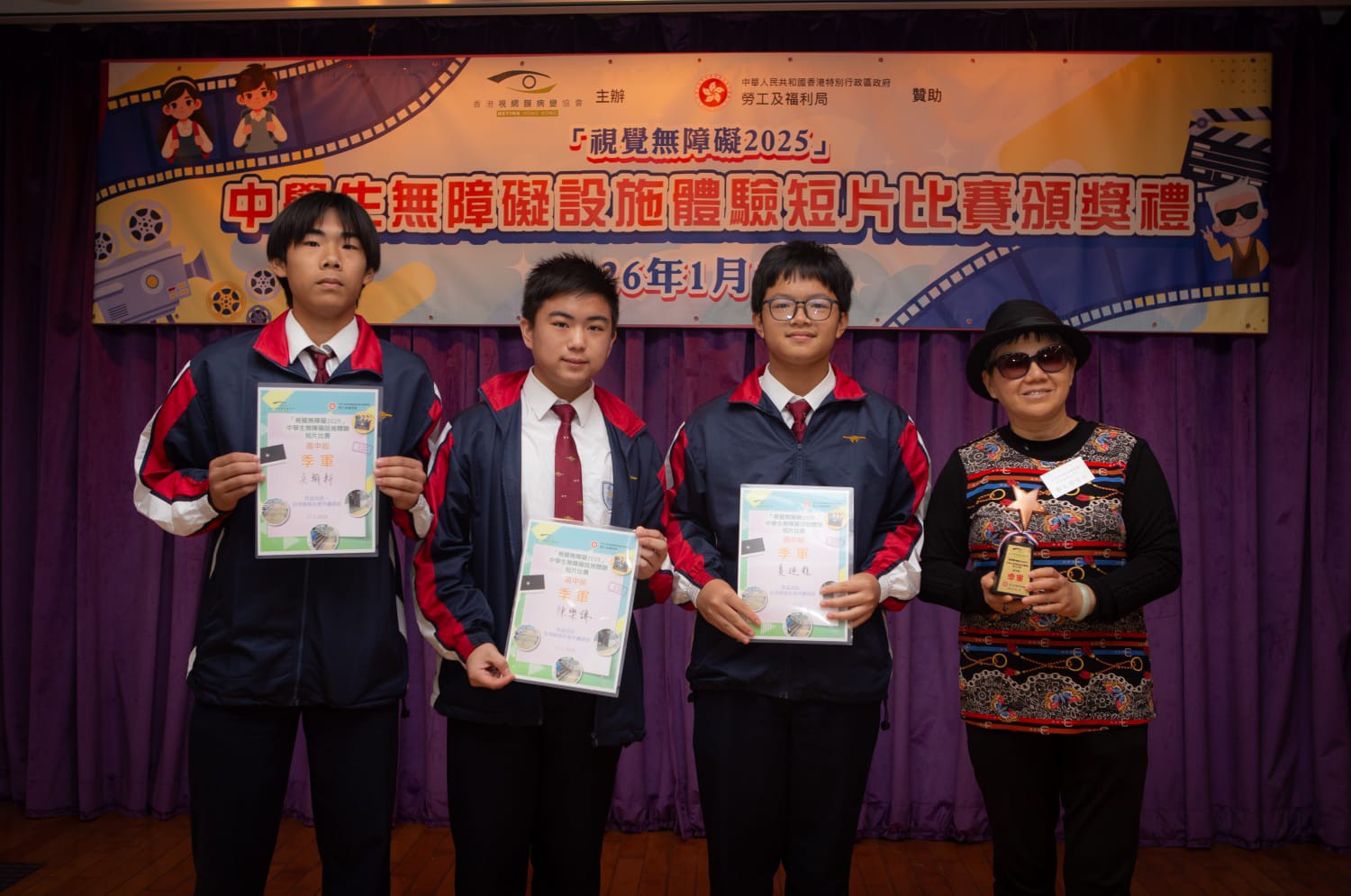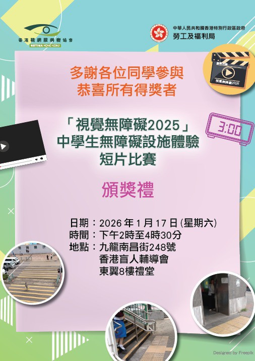 香港視網膜病變協會很高興再次獲得勞工及福利局支持及贊助是次比賽,其頒獎典禮已於2026年1月17日下午2時至4時30分、假座九龍南昌街248號香港盲人輔導會東翼8樓禮堂成功舉行,得獎同學團隊、老師、家長與親友、頒獎嘉賓、本會會員及工作人員等等共百多人濟濟一堂,非常熱鬧興奮。